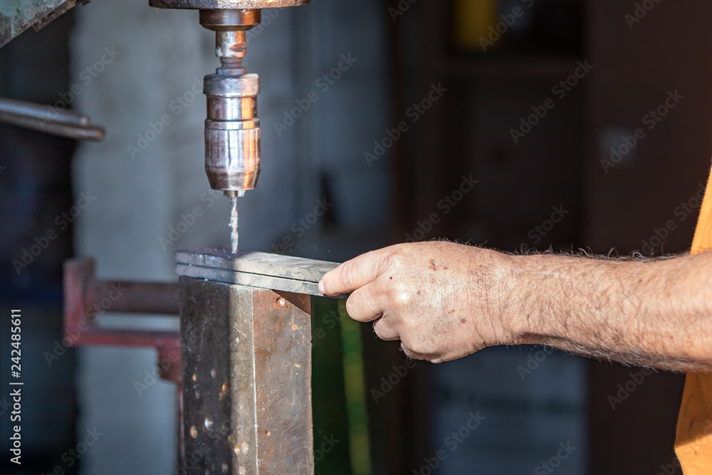 A male worker operating an industrial drill machine inside an aluminiun factory.