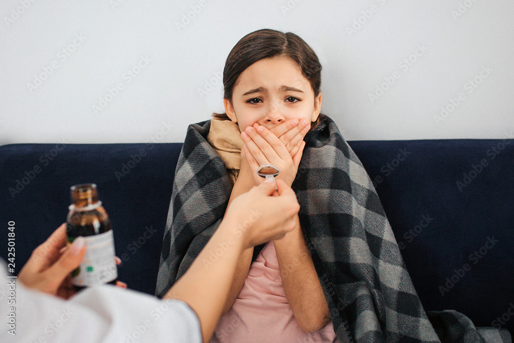 Small girl look on camera and cover mouth with hands. She is frightened. Female doctor give her spoon with syrup. Girl doesn't want to open mouth.