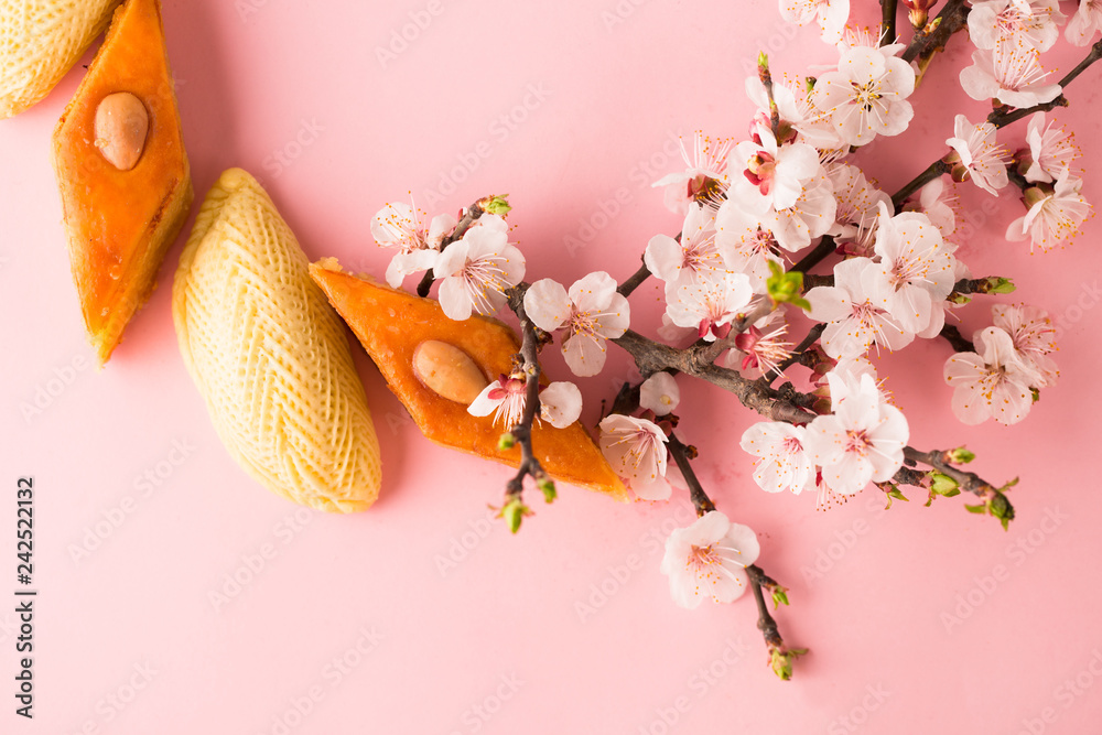 Novruz wreath mock up made of traditional Azerbaijan pastry shekerbura and pakhlava, beautiful tiny blossoms for spring equinox celebration,grey or blue background, flat lay copy space for text