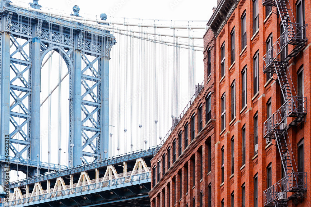 Bridge and brick industrial buildings. The famous suspension Manhattan Bridge photographed from DUMBO district in Brooklyn, New York City.