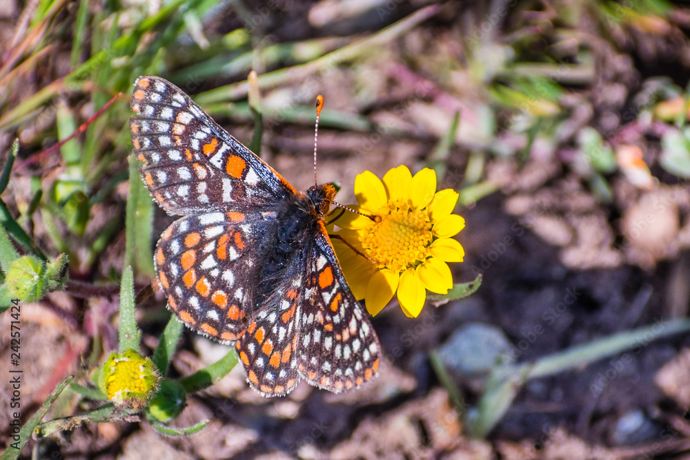 Bay Checkerspot butterfly (Euphydryas editha bayensis) on a goldfield wildflower; classified as a federally threatened species, south San Francisco Bay area, San Jose, California