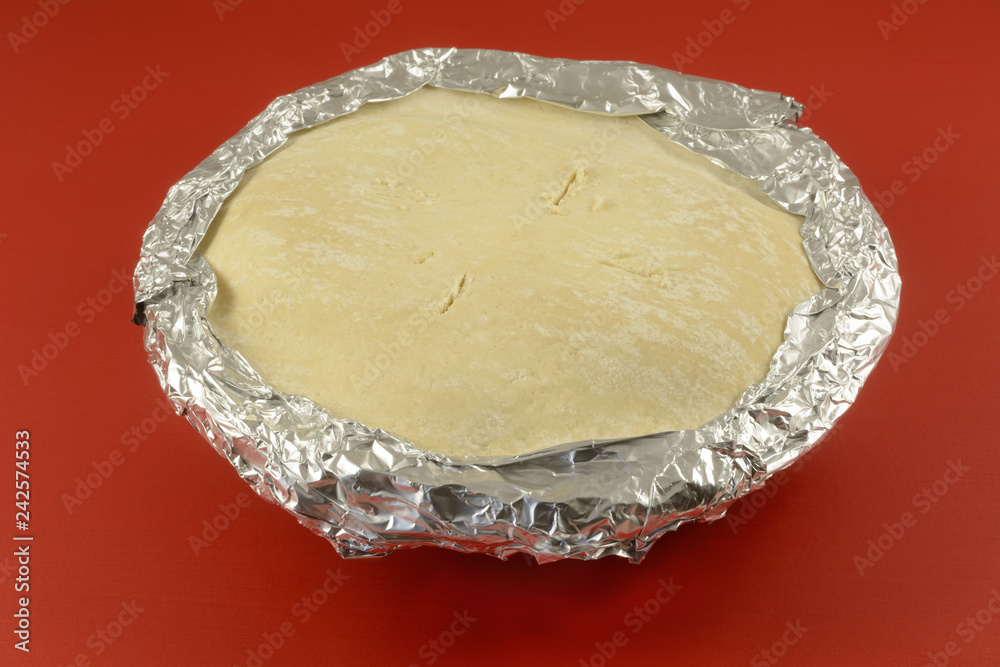 Frozen apple pie prepared for baking with aluminum over edge of crust and slits in top for more even browning and better baking results