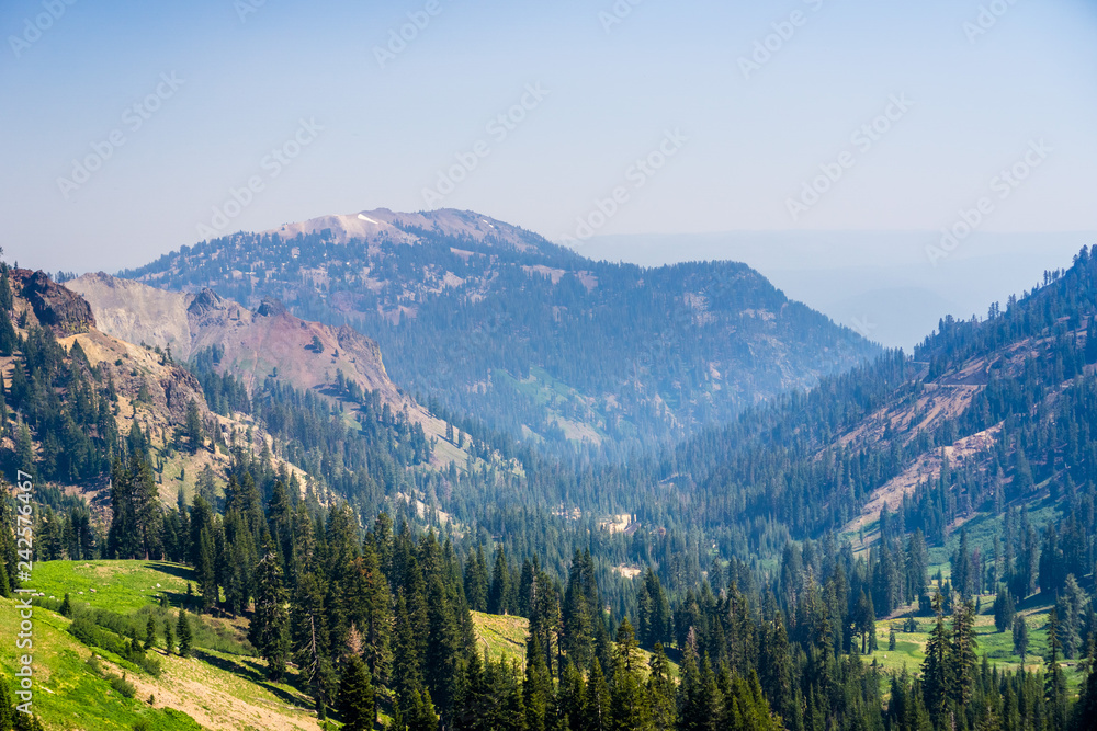 Landscape in Lassen Volcanic National Park with smoke from a nearby wildfire present in the air; Northern California