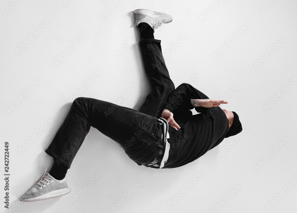 Freestyle dancer dressed in black jeans, sweatshirt, hat and gray sneakers is dancing lying on the floor in the studio on the white background