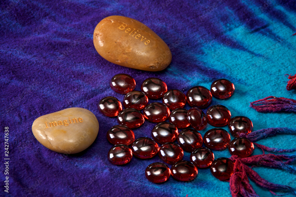 Two large rocks with the words Believe and Imagine on blue cloth background with blood red glass runes.