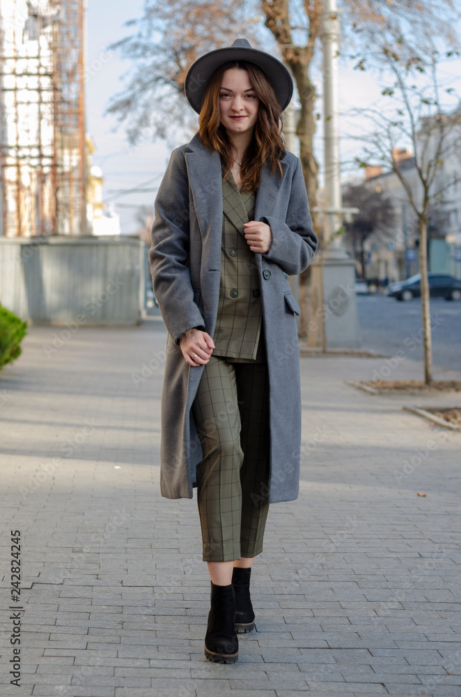 Outdoor portrait beautiful fashionable happy lady posing on street city. Model wearing stylish wide-brimmed hat a women's suit with trousers and an autumn coat. Female fashion. City lifestyle