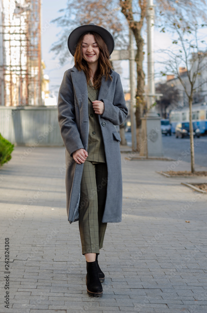 Outdoor portrait of young beautiful fashionable happy lady posing on a street of the old city. Model wearing stylish wide-brimmed hat a women's suit with trousers and an autumn coat. Female fashion.