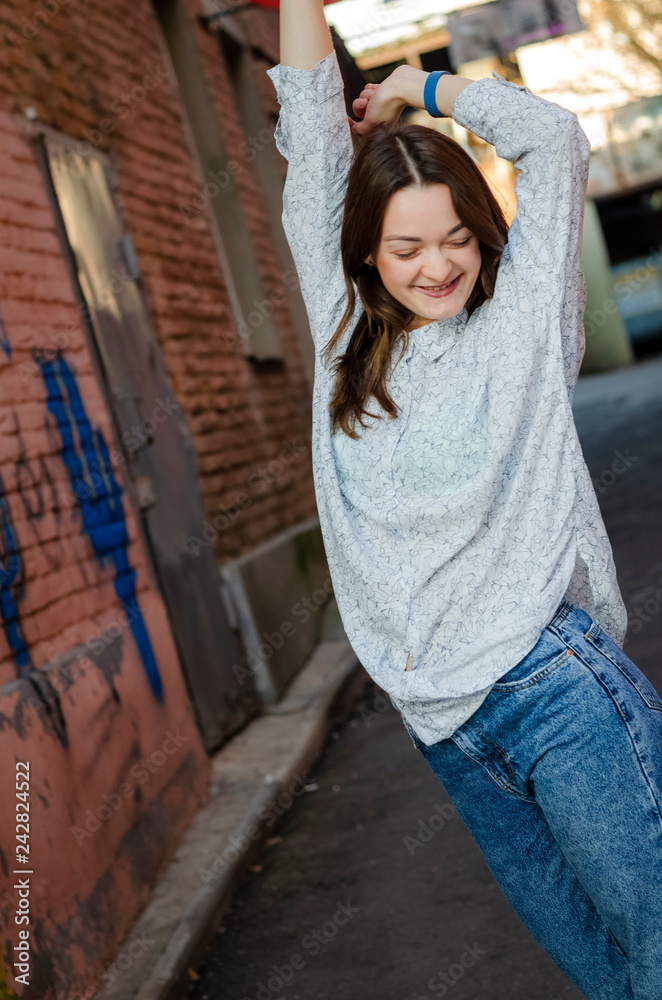 Hipster girl wearing blank white t-shirt, jeans posing against rough street wall, minimalist urban clothing style