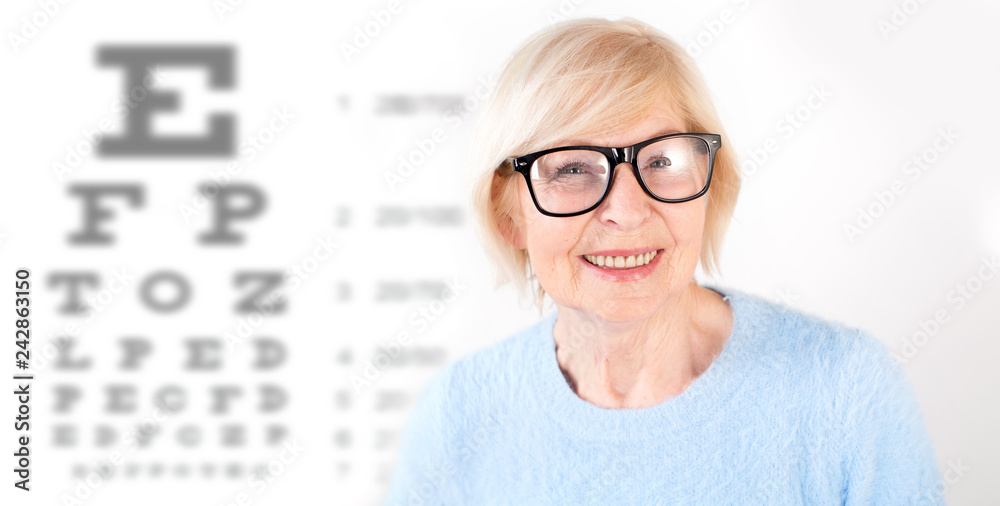Portrait of senior woman in glasses, having eye on the vision testing tables background. Visiting a doctor ophthalmologist.