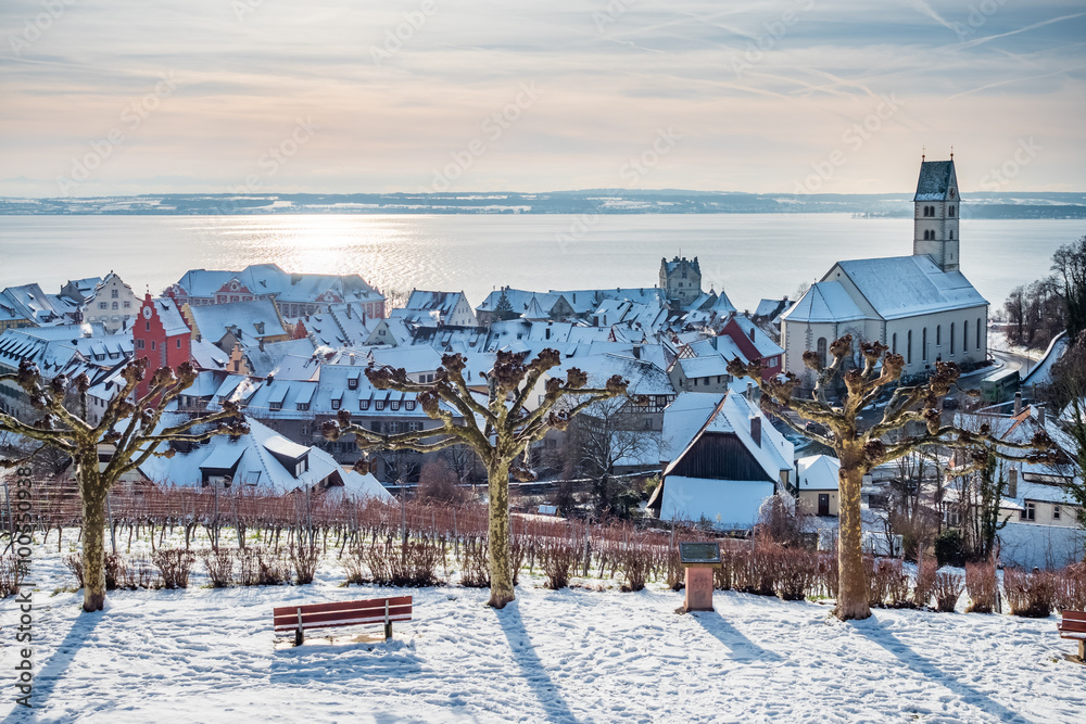 Aerial view of Heidelberg town and Neckar river in winter with snow from the castle in the Baden-Wurttemberg region of southwest Black Forest in Germany during winter Christmas time
