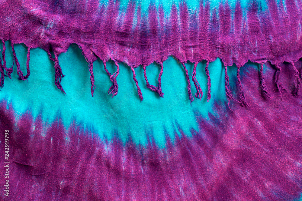 Close up of multi colored tie dyed fabric background cloth hanging showing edge and tassels, pink and purple on aqua blue.