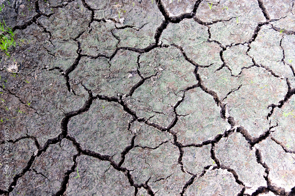 Close up of land cracked for background and texture . The soil crack from disaster of shortage water on planet and the root cause from climate change and drought. Global warming concept.