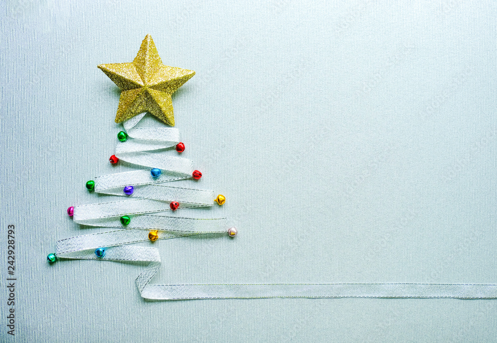 Merry Chistmas tree made from silver ribbon and gold star and small colorful ball on white background. Merry chirstmas and happy new year concept