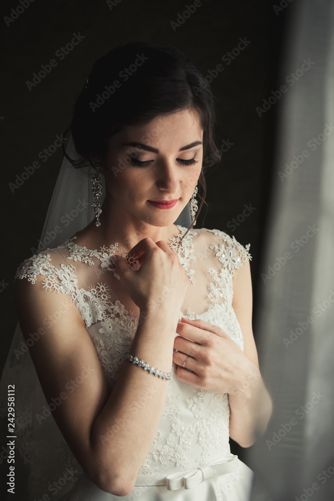 Beautiful bride perfect style. Wedding hairstyle make-up luxury wedding dress and bride's bouquet. Young attractive multi-racial Ukrainian Caucasian model like a bride against white room