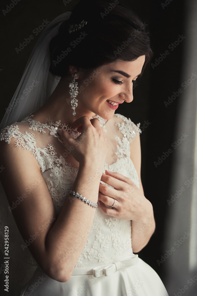 Beautiful bride perfect style. Wedding hairstyle make-up luxury wedding dress and bride's bouquet. Young attractive multi-racial Ukrainian Caucasian model like a bride against white room
