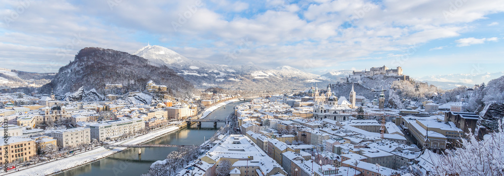 Panorama of Salzburg in winter: Snowy historical center, sunshine