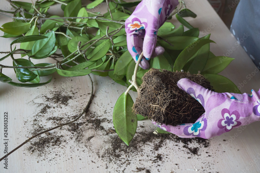 Transplantation of houseplants. The roots of healthy hoya vines.