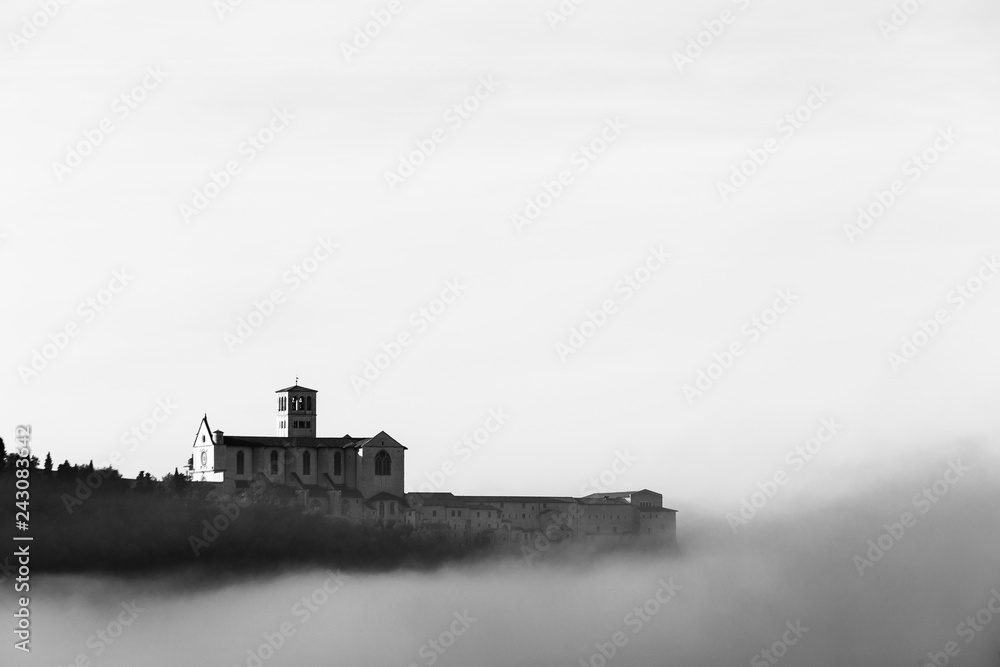 A view of St.Francis church in Assisi in the middle of mist beneath a deep sky with clouds