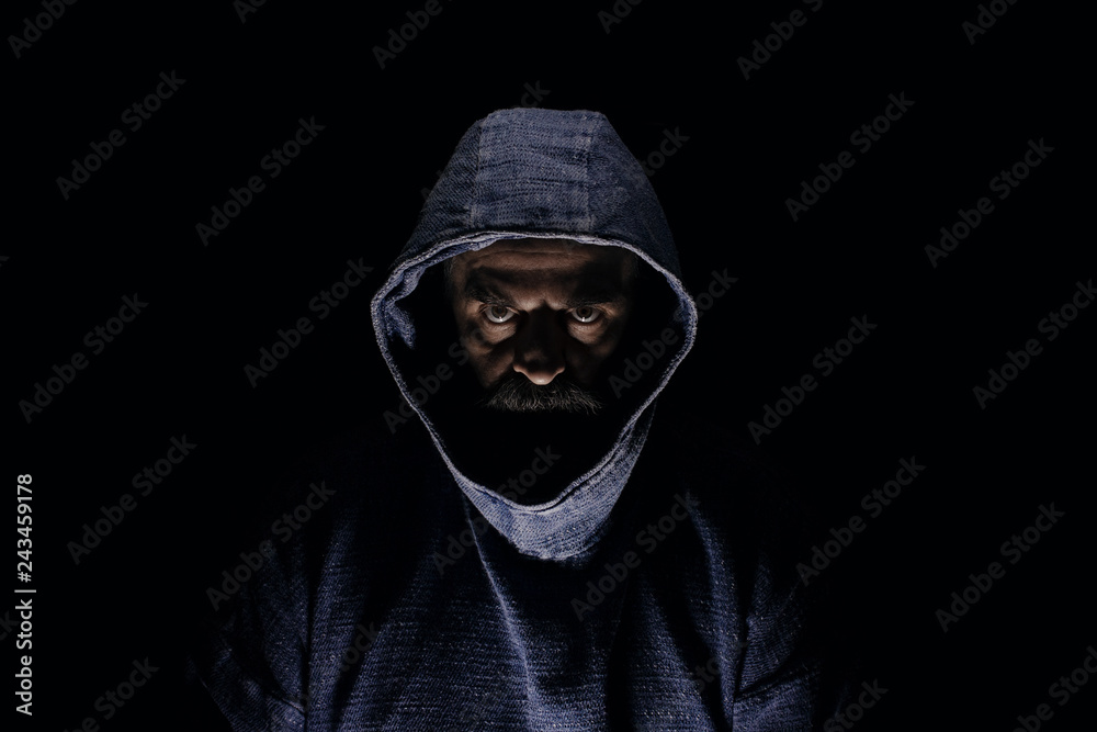 Dark mysterious man with beard looking ominous, wearing blue hoodie, sitting in total dark