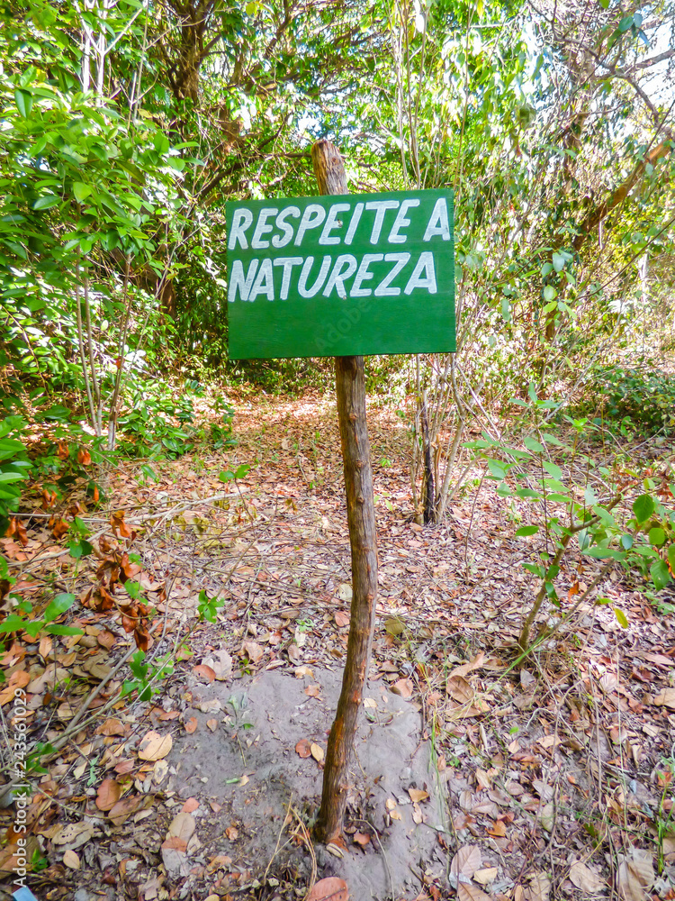 Sign written "Respect nature" in Portuguese at trilha dos holandeses (Dutch trail), hiking path in Ilha de Itamaraca, Brazil