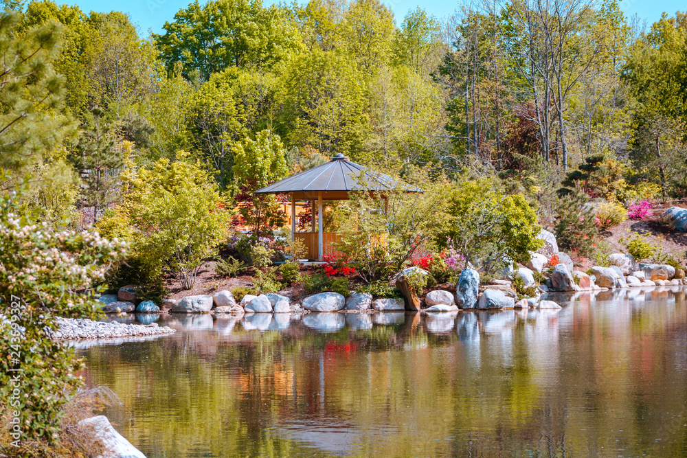 Landscape shot of a gazebo along the pond in the japanese garden at the Frederik Meijer Gardens in Grand Rapids Michigan