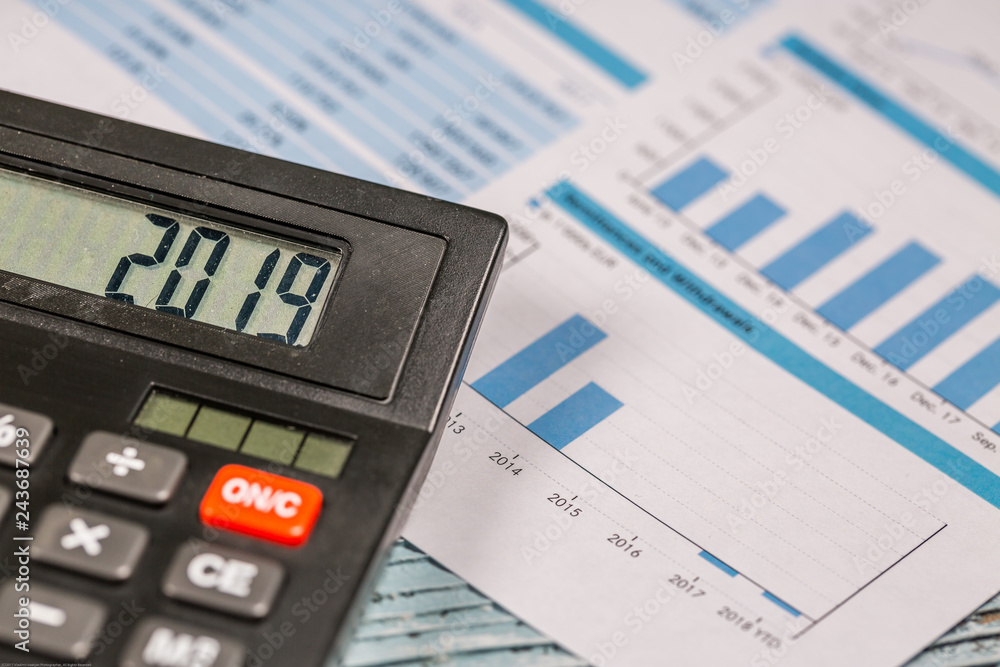 Office Supplies - Calculator with 2019 digits and document are on the wooden table