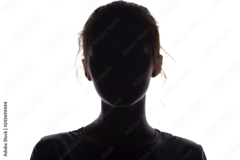 silhouette of a girl confidently looking forward, a young woman's head with a curl on a white isolated background