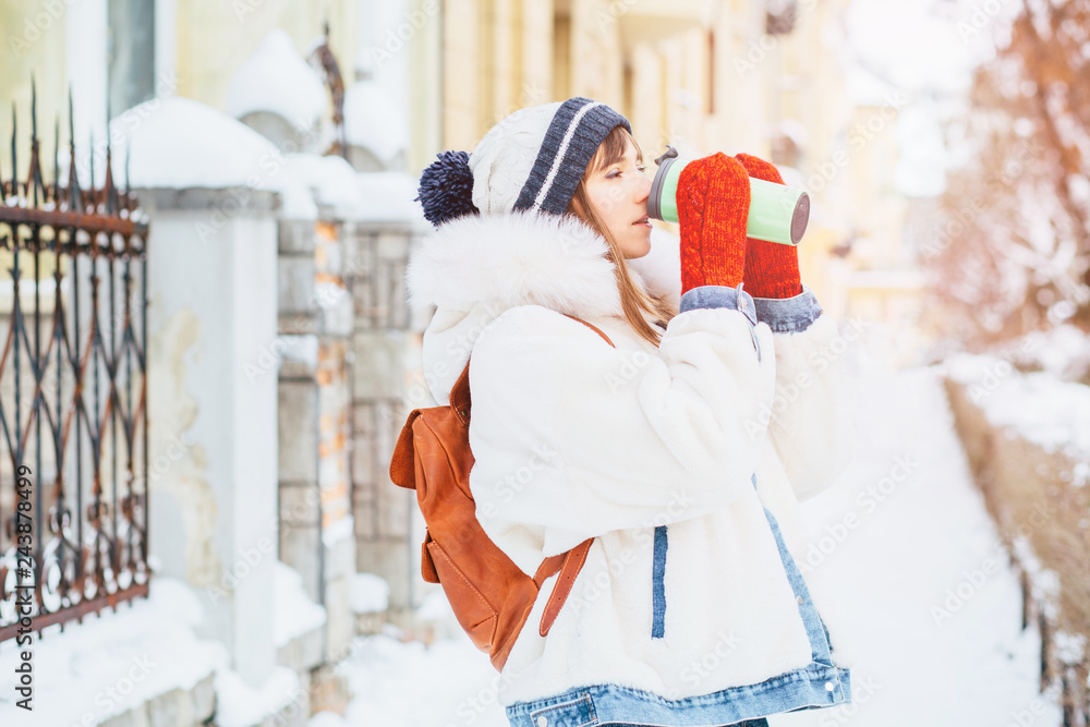 Gorgeous female drinking hot dring from the thermo cup on street in good mood. Outdoor photo of glad woman in knitted red mittens, white fur jacket having fun during winter photoshoot before christmas