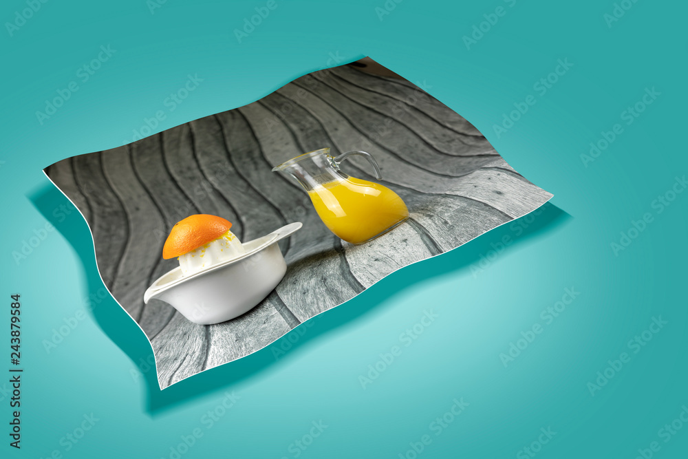 Foto mit Saftpresse und Kanne auf türkisen Hintergrund
