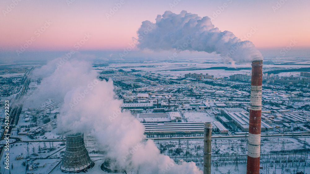 Aerial view of Combined heat and power plant in industrial zone. Cheboksary City, Russia. Heavy industry from above.