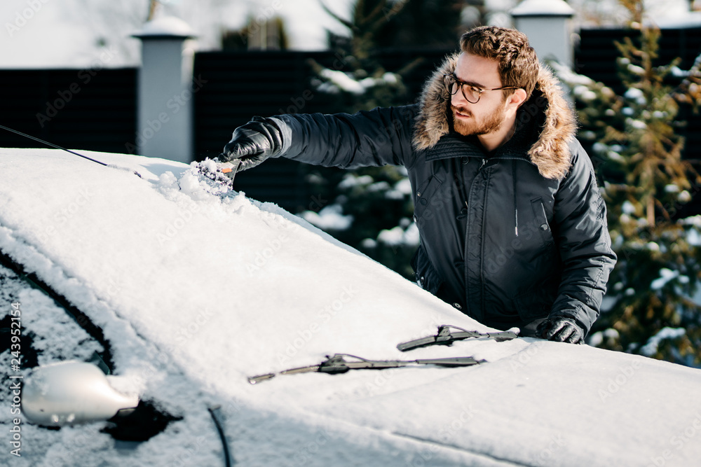 Caucasian man removes snow from vehicle, cleaning snow after blizzard
