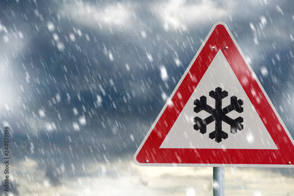 Verkehrschild warnt vor starkem Schneefall und Straßenglätte