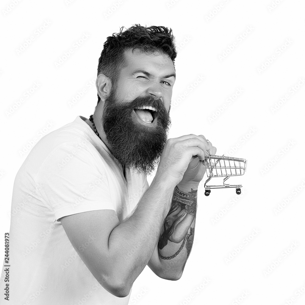 Bearded man wearing white t-shirt holding mini shopping cart on hands. Closeup portrait of businessman showing mini shopping cart, online shop, ecommerce concept. e-commerce and shopping concept.