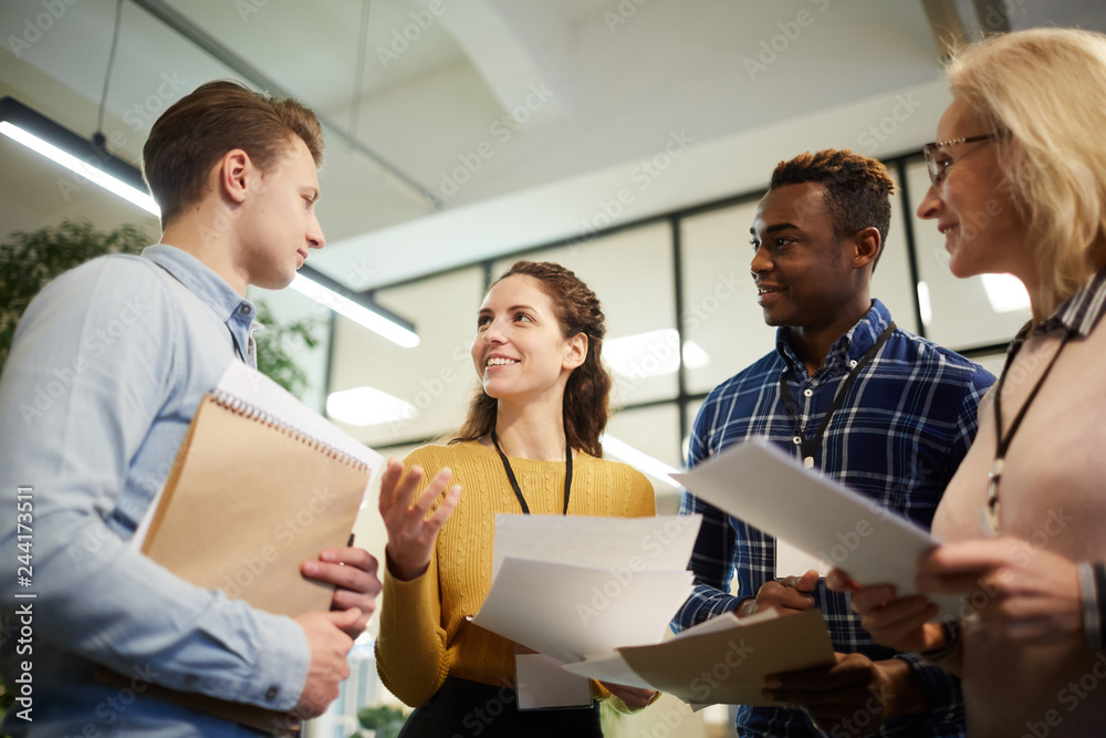 Team of intercultural businesspeople in casualwear preparing for forthcoming conference in office
