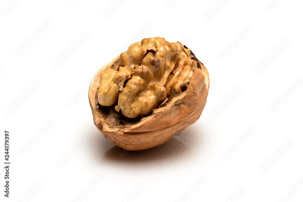 Open walnut with full kernel, close up macro, isolated on a white background.