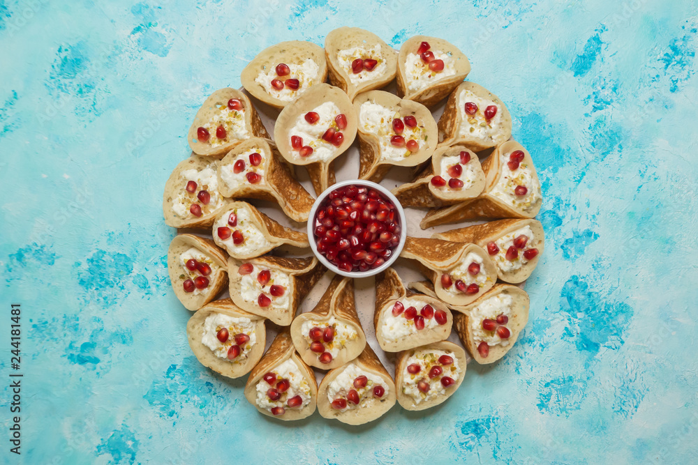 Traditional Arabic crepes stuffed with cream, prepared for iftar in Ramadan.