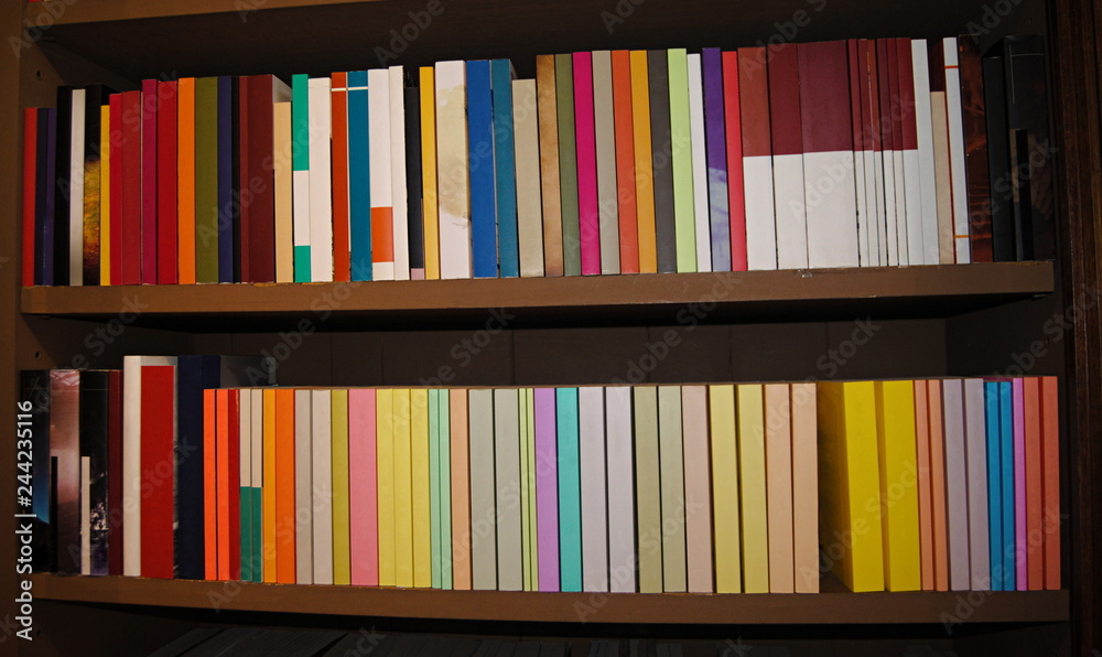 Prateleira em madeira de biblioteca cheia de livros coloridos