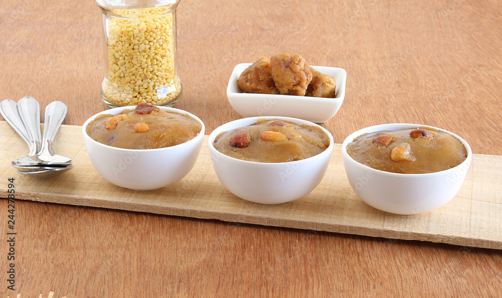 Moong dal halwa, a delicious and tasty, Indian vegetarian sweet cuisine, and its main ingredients like moong or mung and jaggery, is typically made on the day of Indian festivals like Diwali and Dasar