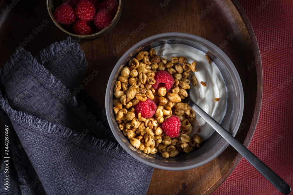 The Crunchy Wheat & Barley Cereal, fresh raspberries and greek yogurt. Flat lay.