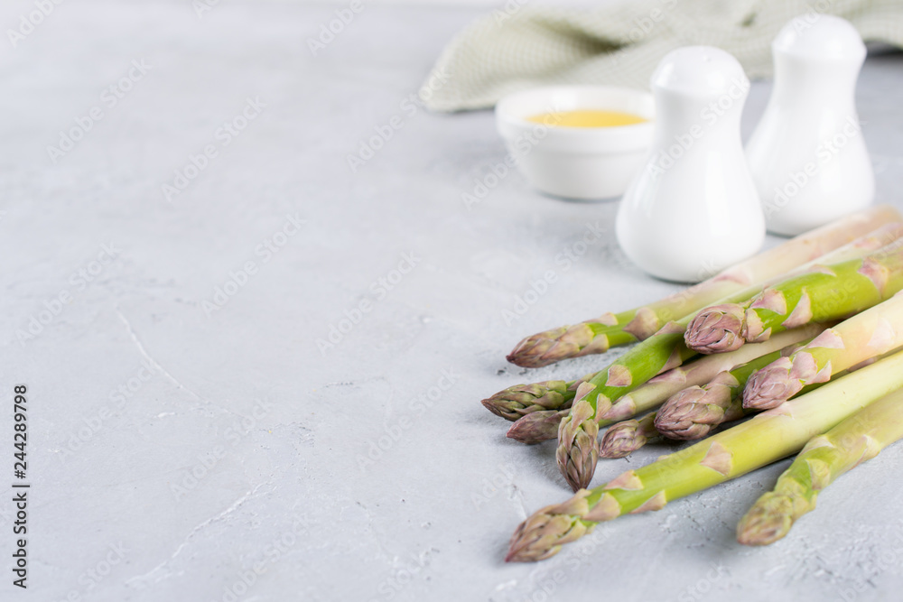Bunch of raw fresh garden organic asparagus with eggs on a gray concrete background. Simple products for a healthy spring breakfast. Space for text Background for a recipe.