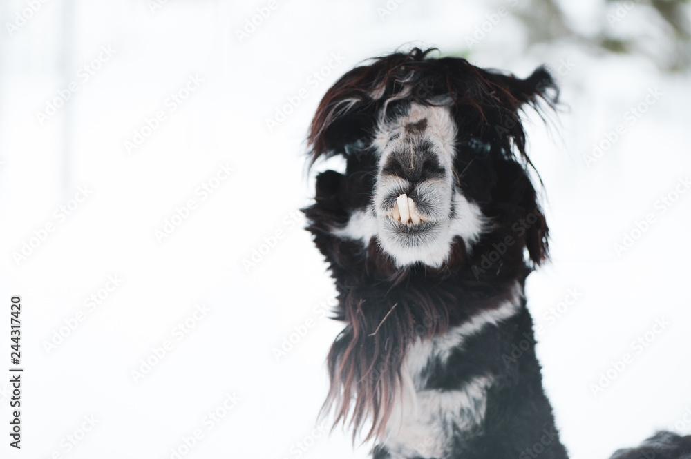 Funny Alpaca with crooked teeth sticking out, comical animal, joke, space for text