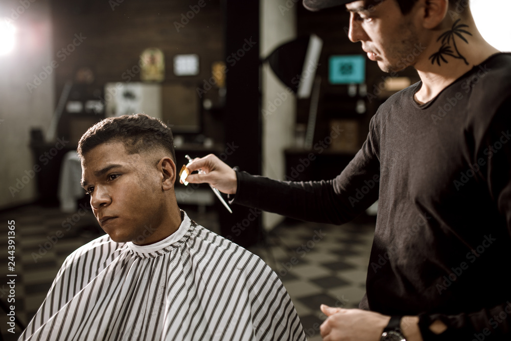 The barber scissors hair on the sides for a stylish black-haired man in the barbershop. Men's fashion and style