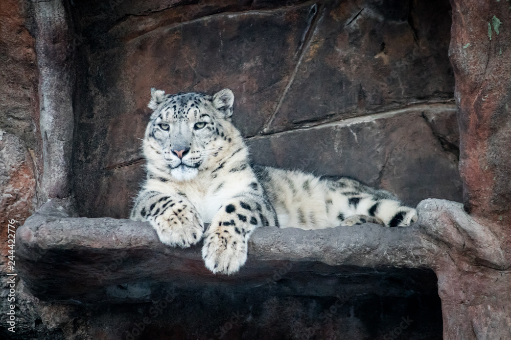 Lone snow leopard amidst a rocky outcropping in the cool light of winter