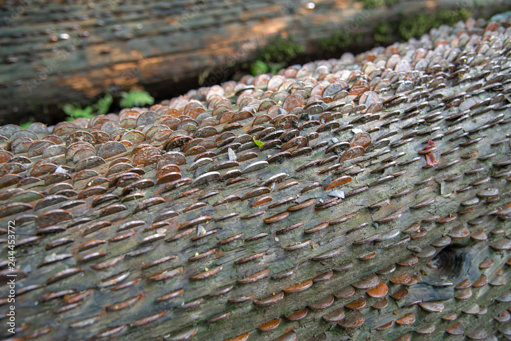 Coins in a Money or Wish Tree in St Nectans Glenn near Tintagel in northern Cornwall.
