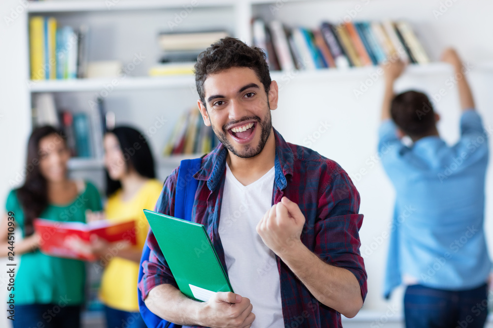 Jubelnder spanischer Student in der Uni-Bibliothek
