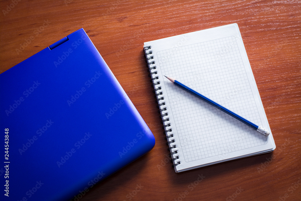 Blue laptop with notebook and pencil on the wooden table