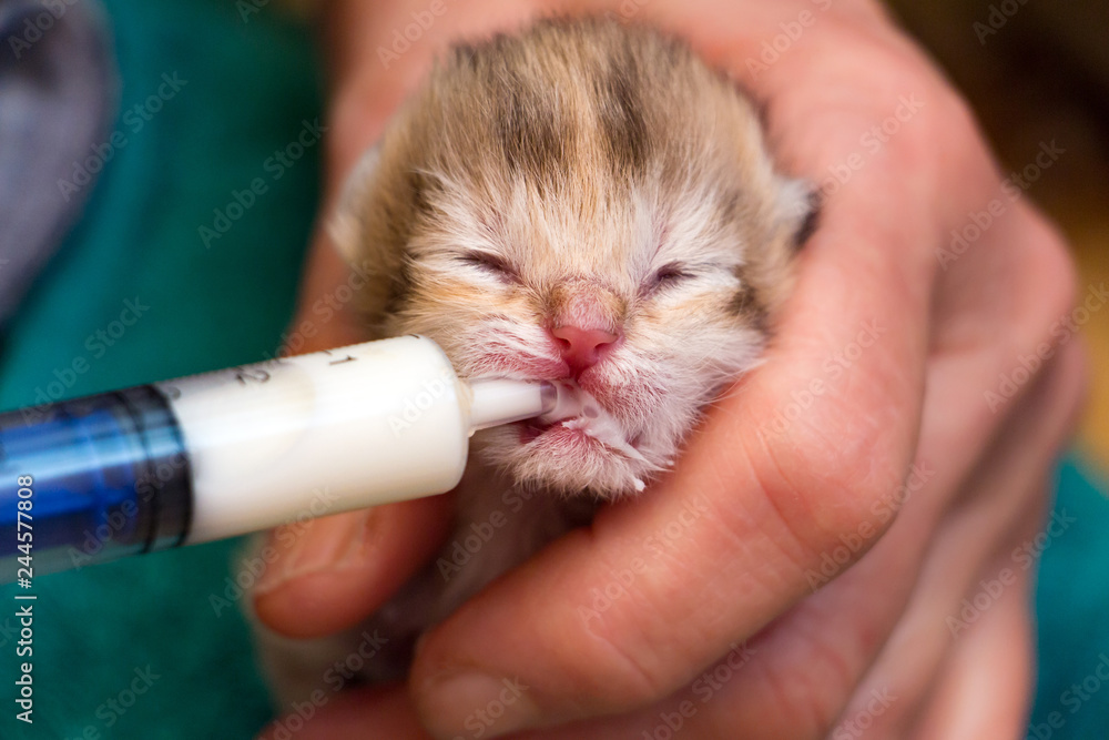 Feeding a newborn British kitten with a milk mixture from a syringe, saving a kitten left without a mother
