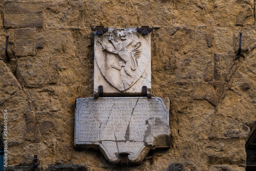 A commemorative stone with on top a rampant lion in San Gimignano