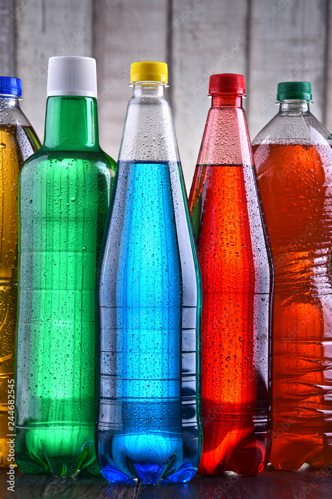 Plastic bottles of assorted carbonated soft drinks