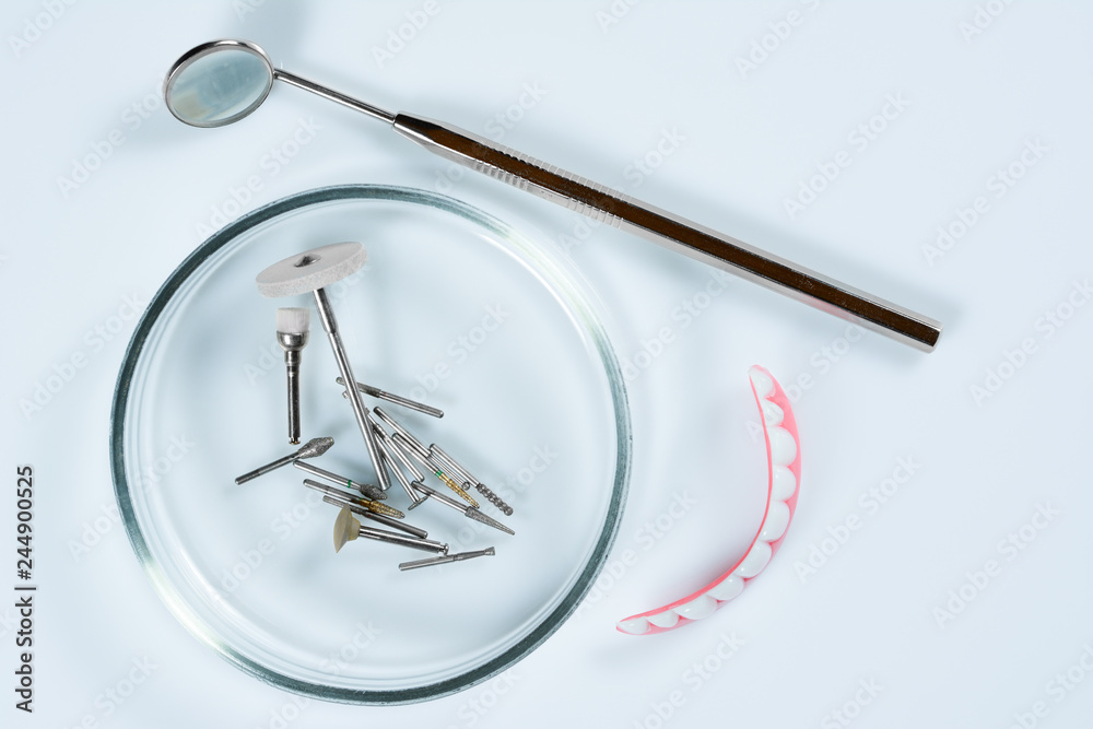 Dental medical tools, dentist equipment: false teeth, stomatological mirror and used dental burs in Petri dish glass on light blue dentist table.